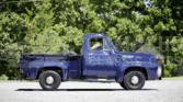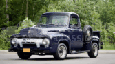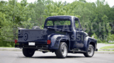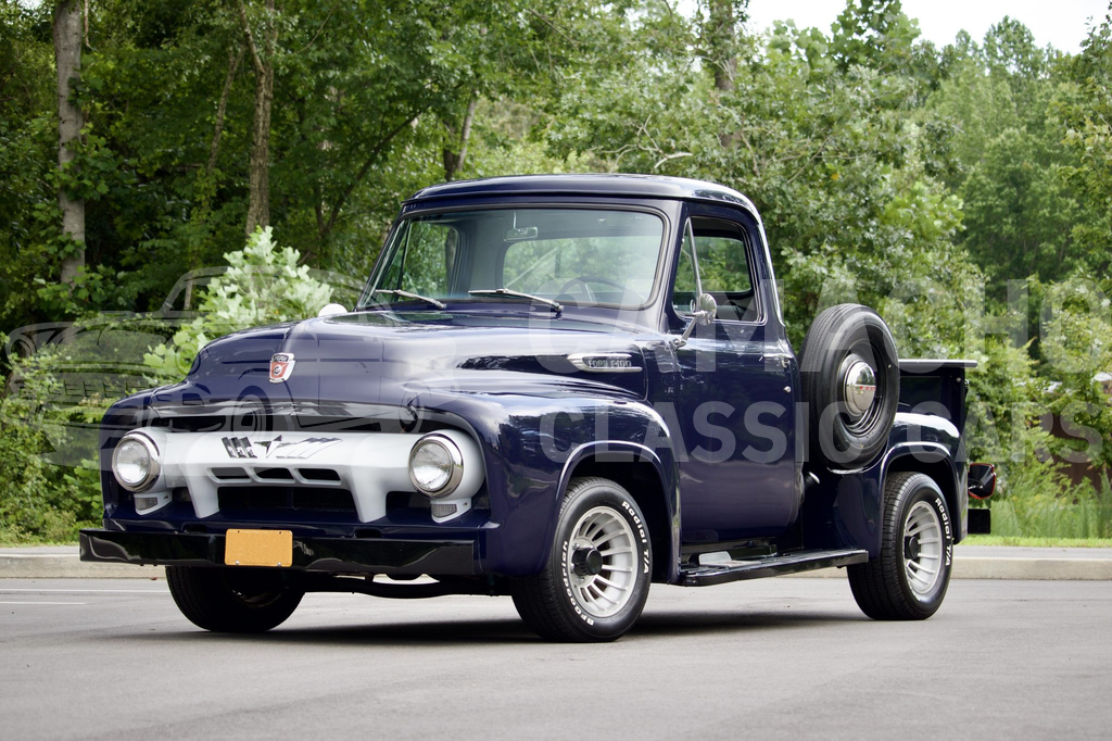 This 1954 Ford F-100 pickup was refurbished in the 1990s with work that included repainting the body in dark blue as well as re-trimming the interior with black vinyl seat upholstery. It was subsequently featured in This Old Truck magazine and won a special award at the 1997 F-100 Supernaturals. Power is provided by a 223ci Cost Clipper inline-six paired with a four-speed manual transmission, and the electrical system has been converted to utilize 12 volts.