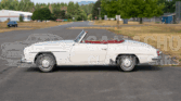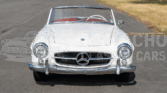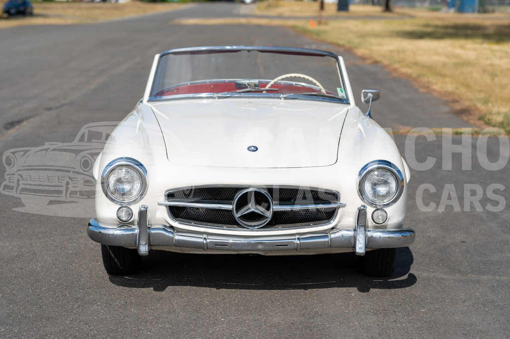 This 1960 Mercedes-Benz 190SL was purchased by the seller in 1980 and subsequently underwent a multi-stage refurbishment, including a repaint in 1984, an interior refresh in 2001, and an engine rebuild in 2022. The car is powered by a 1.9-liter M121 inline-four that has been fitted with dual Weber carburetors and is paired with a four-speed manual transmission. It is finished in white over red leather upholstery, and equipment includes a tan convertible top, a removable body-color hardtop, 13″ steel wheels, and power-assisted drum brakes.