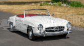 This 1960 Mercedes-Benz 190SL was purchased by the seller in 1980 and subsequently underwent a multi-stage refurbishment, including a repaint in 1984, an interior refresh in 2001, and an engine rebuild in 2022. The car is powered by a 1.9-liter M121 inline-four that has been fitted with dual Weber carburetors and is paired with a four-speed manual transmission. It is finished in white over red leather upholstery, and equipment includes a tan convertible top, a removable body-color hardtop,…