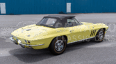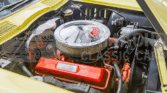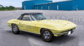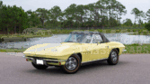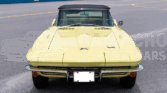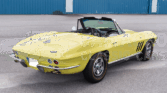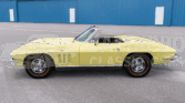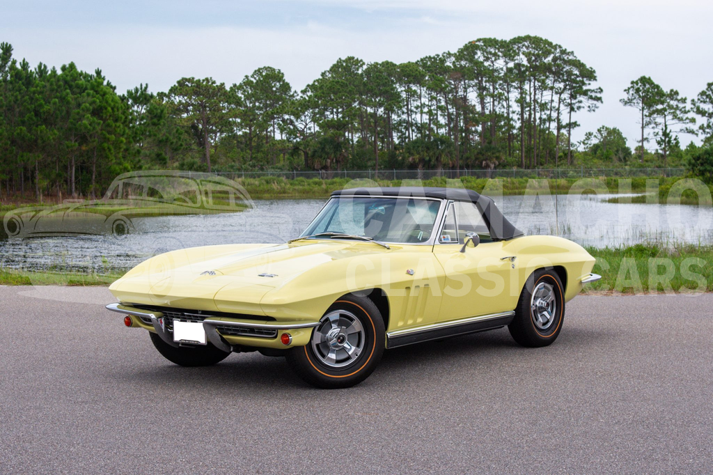 This 1966 Chevrolet Corvette convertible was refurbished between 2007 and 2009 with work including a repaint in Sunfire Yellow and a re-trim of the cabin in black leather upholstery sourced from Al Knoch Interiors. The car is powered by a 327ci V8 linked with a four-speed manual transmission and a PosiTraction differential. It is equipped with a black convertible top, 15″ steel wheels, BFGoodrich gold-stripe tires, four-wheel disc brakes, a reverse-lockout shifter, a cabin heater, an AM/FM radio, and retractable headlights.