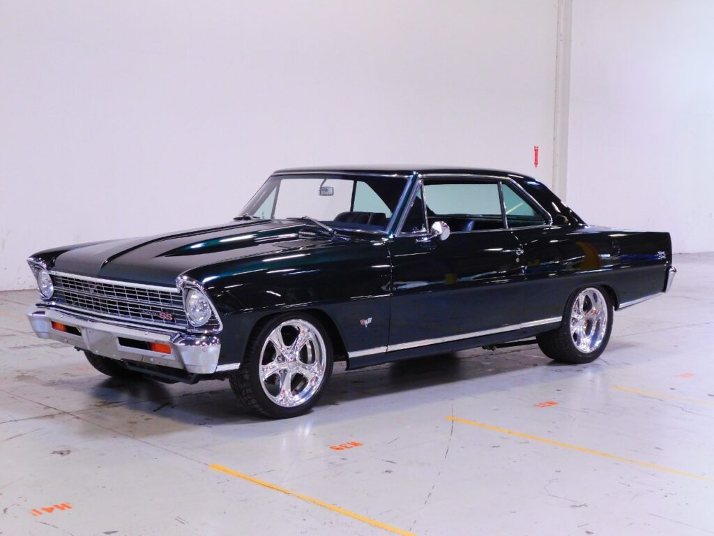 This 1967 Chevrolet Nova SS is a classic American muscle car that combines power, style, and comfort. The vehicle features a striking green exterior that complements its black leather interior, creating a timeless aesthetic. Under the hood, the Nova SS is powered by a robust V8 engine paired with a manual transmission, offering a thrilling driving experience synonymous with the golden era of American muscle cars. The car is equipped with power brakes for reliable stopping power and a tilt steering wheel for comfortable maneuverability. Additional features include air conditioning, an AM/FM radio, and stylish custom rally wheels. The leather interior adds a touch of luxury and durability, making this car a blend of performance and comfort that embodies the spirit of classic American muscle.