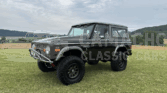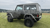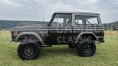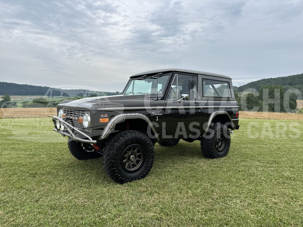 This 1977 Ford Bronco is powered by a 4.6-liter DOHC SVT V8 linked with a Rockland Terminator five-speed manual transmission and a dual-range transfer case, and is finished in black over gray cloth upholstery. A gray-finished removable hardtop, tubular front bumper, and bolt-on fender flares are fitted as well as a suspension lift kit, power-assisted front disc brakes, 16″ American Racing wheels, LED headlights, tubular bumpers, cut fenders, a roll cage, Dakota Digital instrumentation, a locking center console, Corbeau seats, and a Pioneer touchscreen infotainment system.