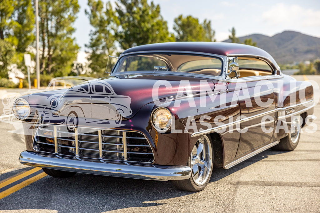 This 1954 Chevrolet Bel Air Sport Coupe underwent body modifications under previous ownership and features a chopped roof, a smoothed and tucked rear bumper, a custom grille, frenched vertical taillamps, and a custom rear roll pan as well as shaved door handles and front fender lights. The car is powered by a supercharged stroker 383ci V8 mated with a 700R4 four-speed automatic transmission and is finished in cherry red over tan leather upholstery. Equipment includes a Weiand supercharger, a Holley four-barrel carburetor, a billet serpentine drive system, a Mustang II-style front suspension, power steering, power four-wheel disc brakes, and staggered American Racing wheels as well as Vintage Air climate control, Dakota Digital instrumentation, remote-controlled door poppers, and a custom audio system.